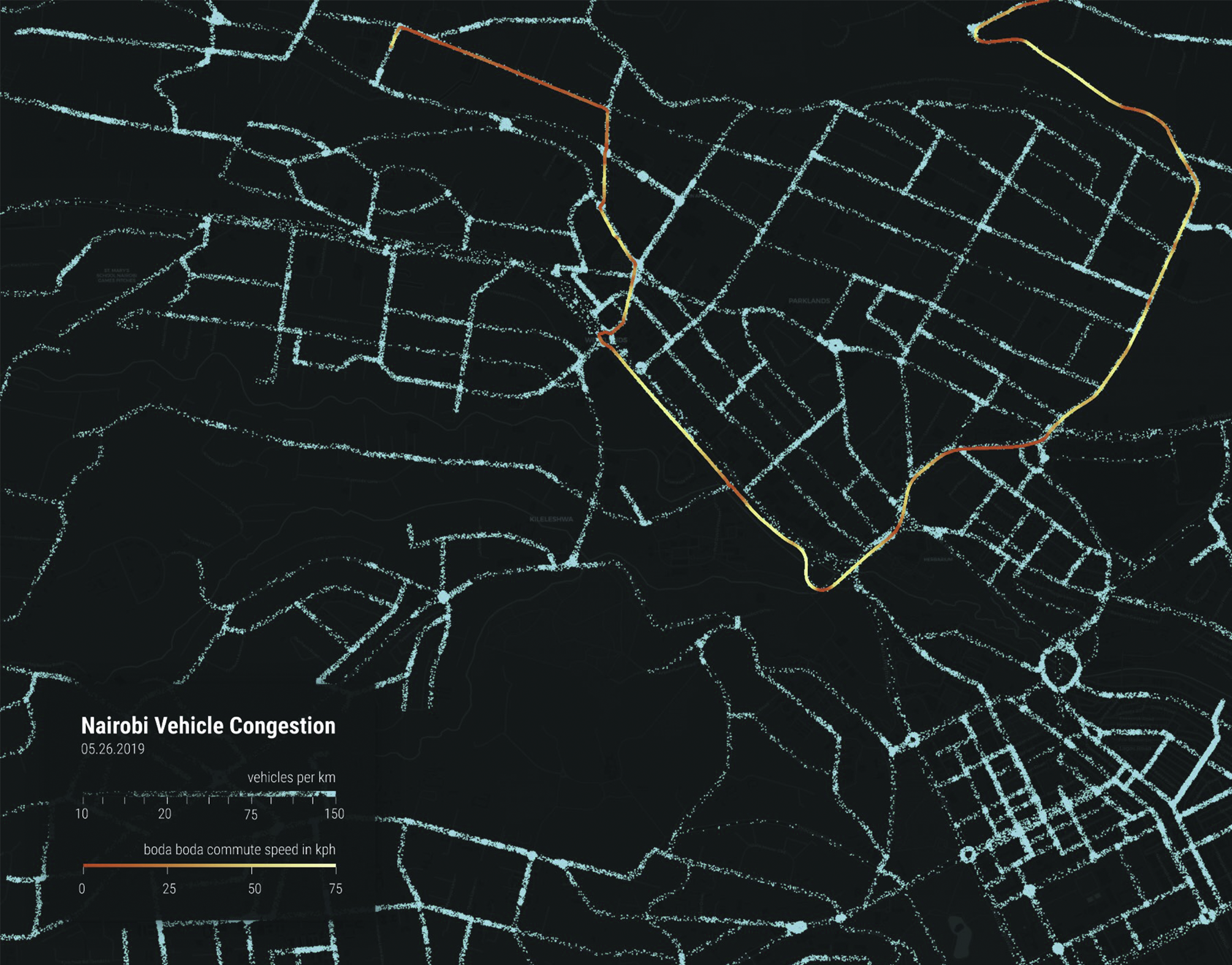 Nairobi is home to 3.5 million people. Due to a lack of centralized transport planning in its history of growth, present-day urban traffic is often paralytic and commuters may be trapped in their cars for several hours each day. This work screens citizen traffic data collected from Uber, mobile phone, and Google data, displaying visualizations of Nairobi's breathtaking traffic congestion on an exhibit wall. These visualizations are presented in conjunction with the travel routes of four selected Nairobi commuters postulate the link between their personal experiences and urban traffic problems.