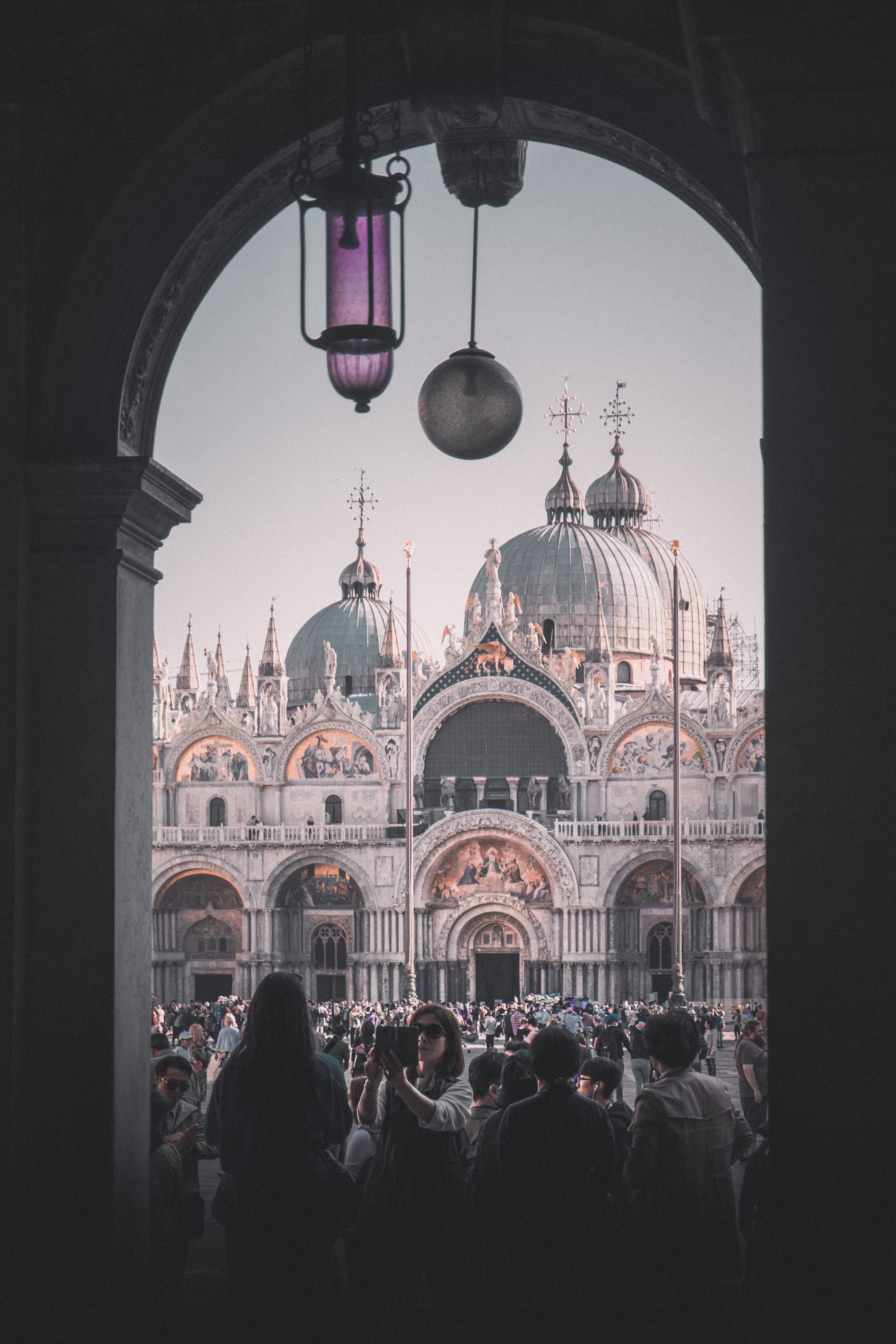A group of tourists snaps some selfies from the ground floor of the former Palazzo Reale, at the west end of Piazza San Marco. The numerous arches of the Procuratie act as urban frames for astonishing views of San Marco Basilica | © Jiakun He, 2018
